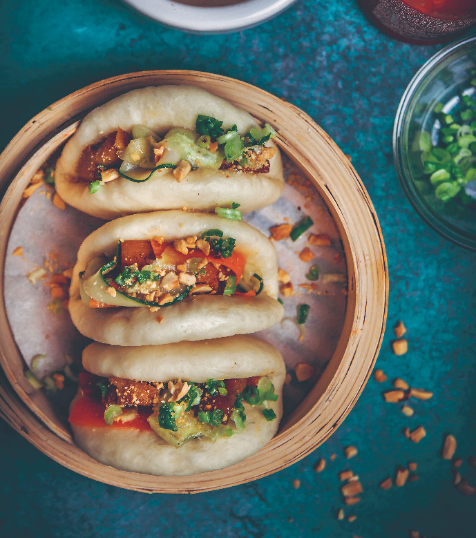 - Den Dämpfkorb auf einen Topf mit kochendem Wasser setzen. 3 oder 4 Brötchen mit genügend Abstand in den Dämpfkorb legen. Den Deckel aufsetzen und die Hitze so regulieren, dass das Wasser siedet. Die Brötchen 15 Minuten dämpfen, bis sie durchgebacken sind. Den Deckel alle 5 Minuten kurz anheben, damit Dampf entweichen kann, sonst geht der Teig zu schnell auf und fällt in sich zusammen. Die Brötchen mit Süßkartoffelspalten, Pickles, Erdnüssen und Koriander füllen und mit einem Spritzer Sriracha-Sauce garnieren. Für zusätzliche Aroma können die Gua bao vor jedem Bissen in die Süßkartoffelsauce getunkt werde.