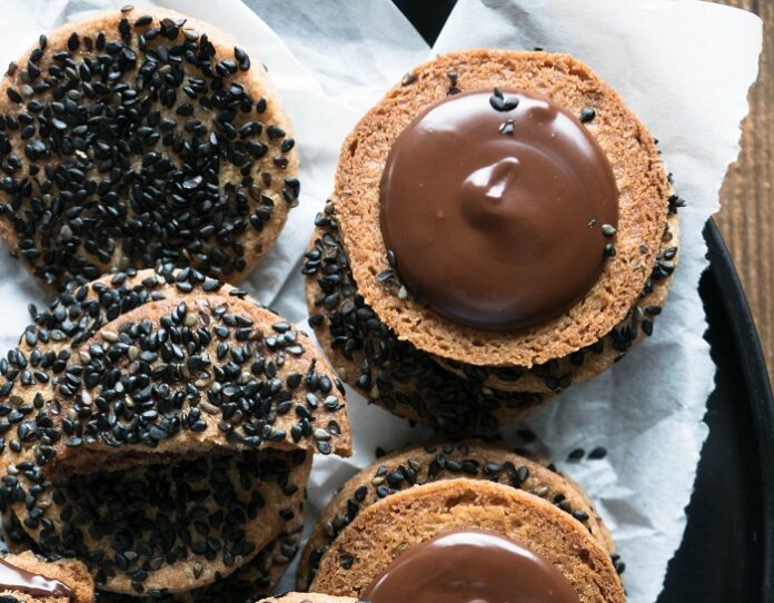 Kochzeitca. 60 Minuten Portionen StückZutaten120 g Dinkelmehl (Type 630)120 g veganer Schokoaufstrich80 g Pflanzenmargarine80 g schwarzer Sesam70 g Puderzucker aus Rohrzucker30 g Speisestärke30 g Tahini3 EL Haferdrink1 TL Agavendicksaft1 Prise Salz