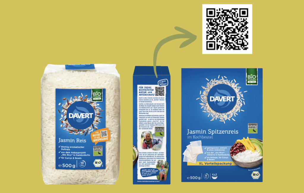 Mit der Initiative „Exploring the Origin” von Davert lassen sich Lieferketten transparent zurückverfolgen – vom Ursprung bis nach Ascheberg (Firmensitz von Davert). Um das zu ermöglichen, arbeitet Davert mit dem Kooperationspartner Seedtrace zusammen. Du möchtest es ausprobieren? Nicht nur auf den Produktverpackungen der Davert Nut Butter: Seit Februar 2025 können Kunden und Kundinnen den Davert Jasmin Reis über die Davert-Website bis zu den Kleinbauern und -Bäuerinnen des „Ibis Rice′′-Projekts in Kambodscha zurückverfolgen. Seit Juni 2025 ist dies auch über den QR-Code auf dem Produkt selbst möglich.